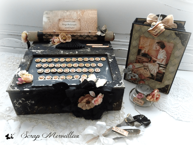 Après le premier projet sur le thème du cirque avec de magnifiques papiers de la marque Italienne CIAO BELLA je vous présente ma machine à écrire « Japy » qui renferme un bien bel album photos de par sa taille et le choix des papiers « The Muse ».