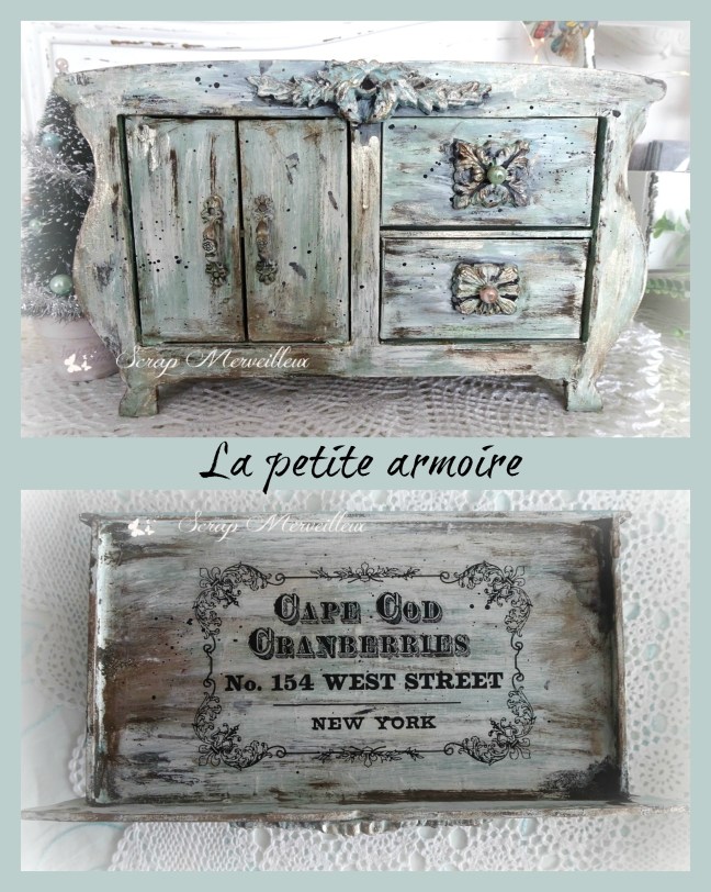 Ensuite j’ai relookée une petite armoire en Mdf qui était recouverte de papier de soie. Changement total de style, elle me plait bien avec son transfert noir sur le dessus…