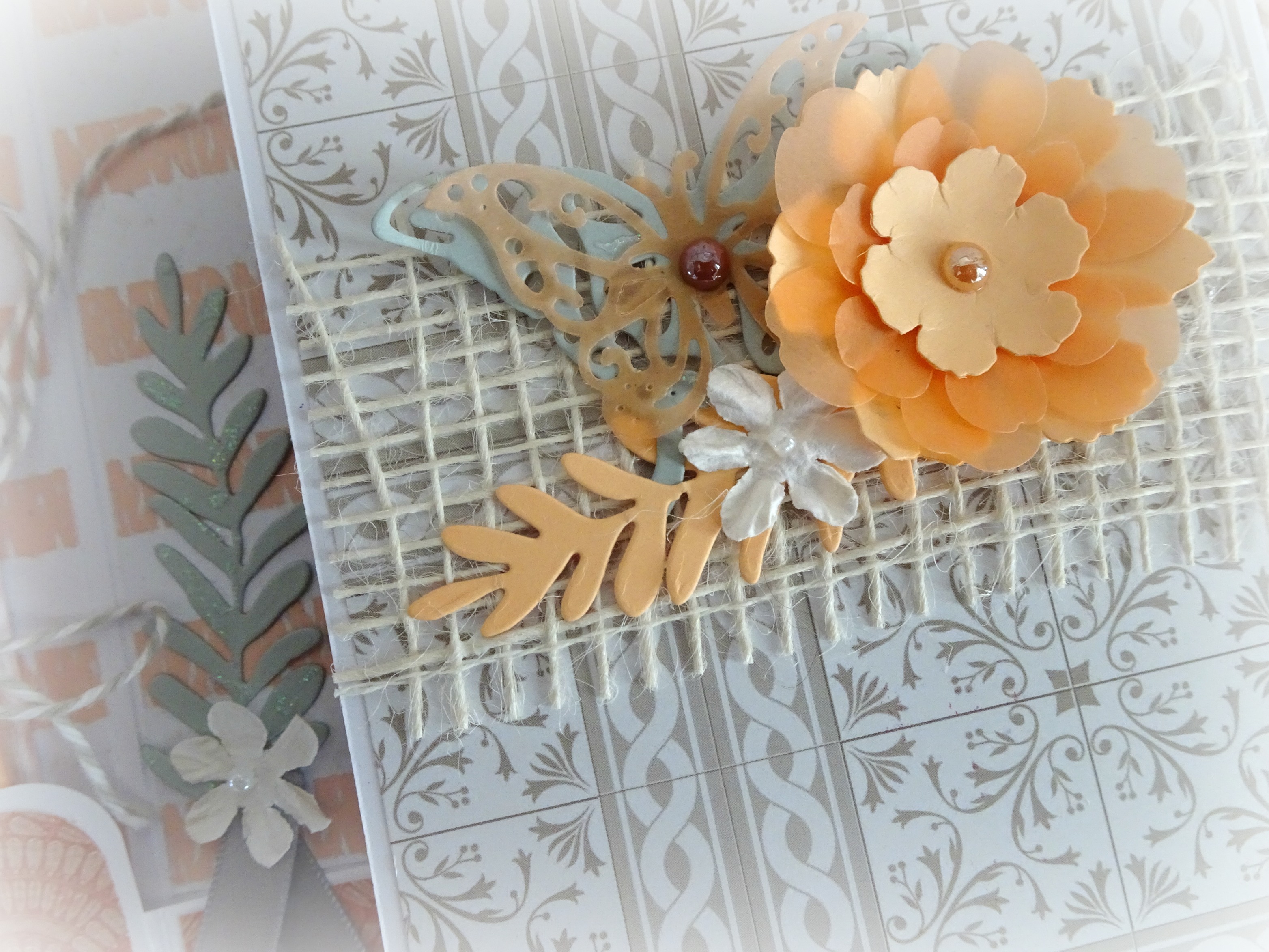 à l’intérieur l’album s’ouvre sur quatres parties contenant des dépliants ou enveloppes, des cachettes, des tags et embellissements dans un esprit nature chic et jeu de transparence…