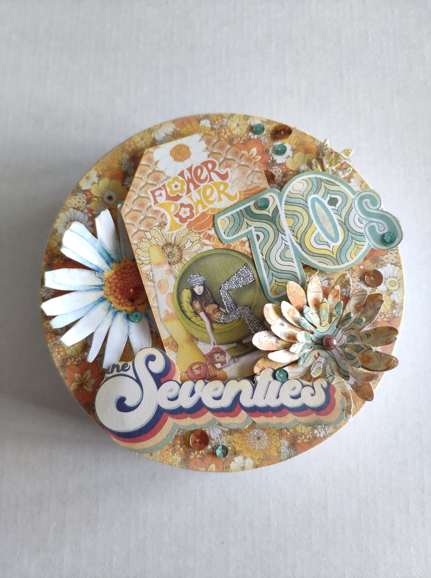 Un petit retour vers les années 70 avec cet album fait avec les papiers de la collection « The Seventies » Ciao Bella » un album photo dont vous pourrez adapter les photos à votre sauce… Vendu dans sa boite ronde d’une taille de 14 cm de diamètre environ sur 4 cm de haut.