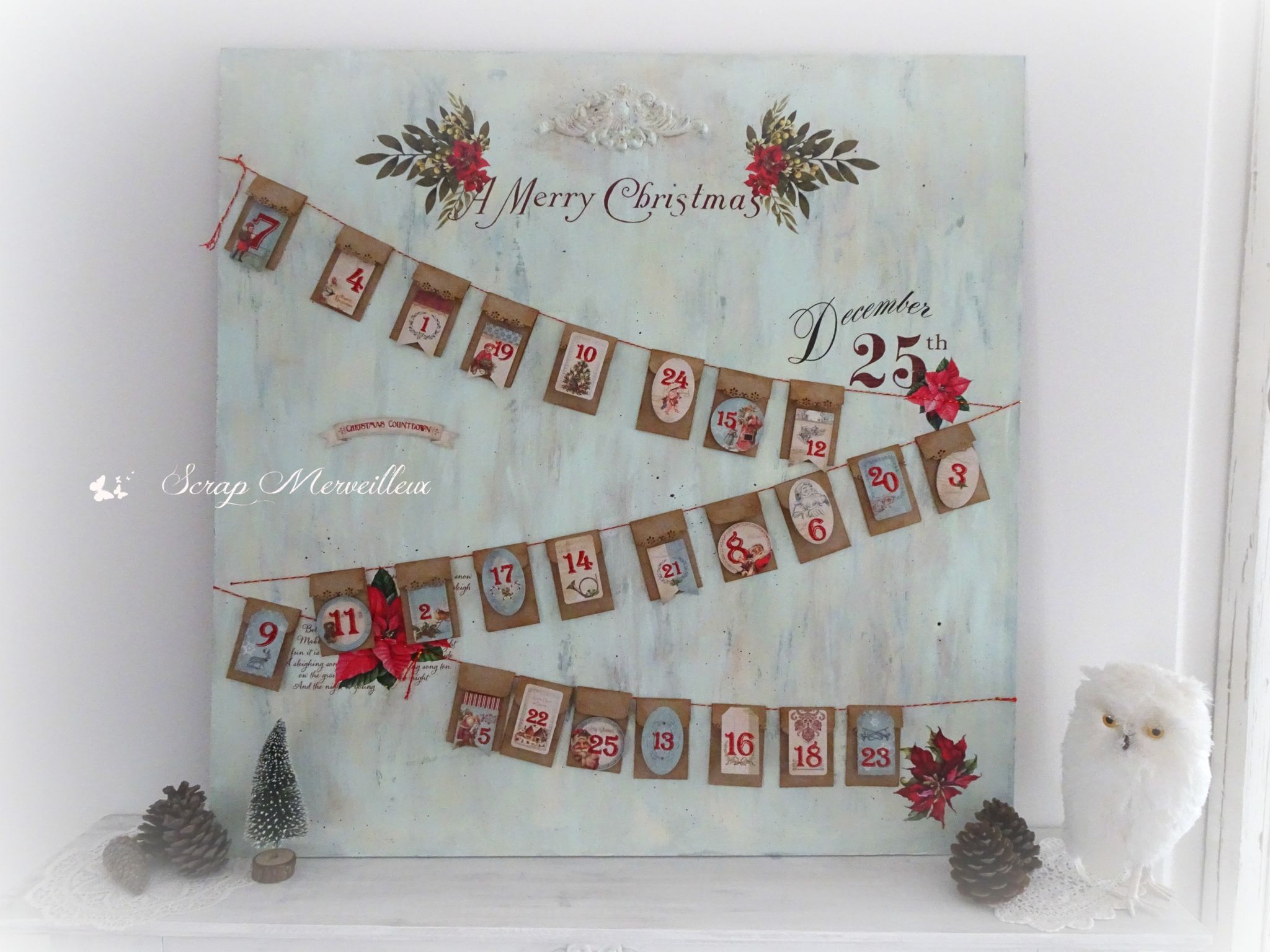 Grand calendrier de l’Avent fait mains sur un panneau de bois, peint et patiné à la main, dessus 25 pochettes cadeaux que vous pourrez remplir de surprises…