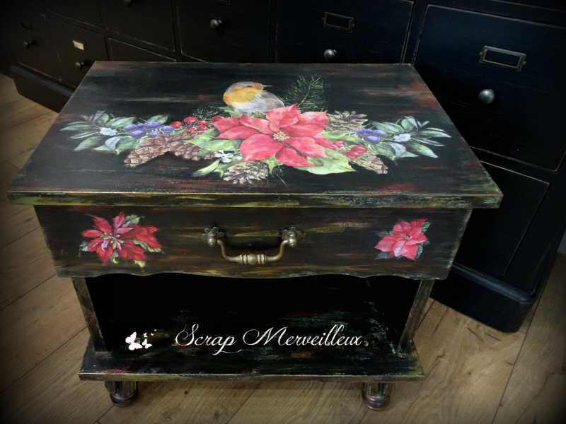 Relooking d’un petit meuble décoré aux motifs d’hiver sur un fond patiné noir. Chevet en bois massif, patiné et décoré dans l’esprit de noël, la couleur de fond est noire avec des effets patiné rouge et or. Il comporte un tiroir, il peut convenir comme chevet, en bout de canapé ou pour une petite table basse d’appoint… il mesure 55cm de large par 38cm de profondeur et environ 54 cm de hauteur.