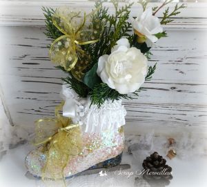 Véritable Patin à glace décoré de branchages de noël et habillé de dentelles anciennes, pailleté…idéal pour votre décoration d’hiver. à suspendre ou à poser. Objet unique. Style shabby chic. pointure du patin 35/36.