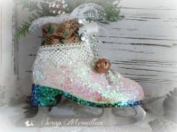 Véritable Patin à glace décoré de branchages de noël et habillé de dentelles anciennes, pailleté…idéal pour votre décoration d’hiver. à suspendre ou à poser. Objet unique. Style shabby chic. pointure du patin 35/36.
