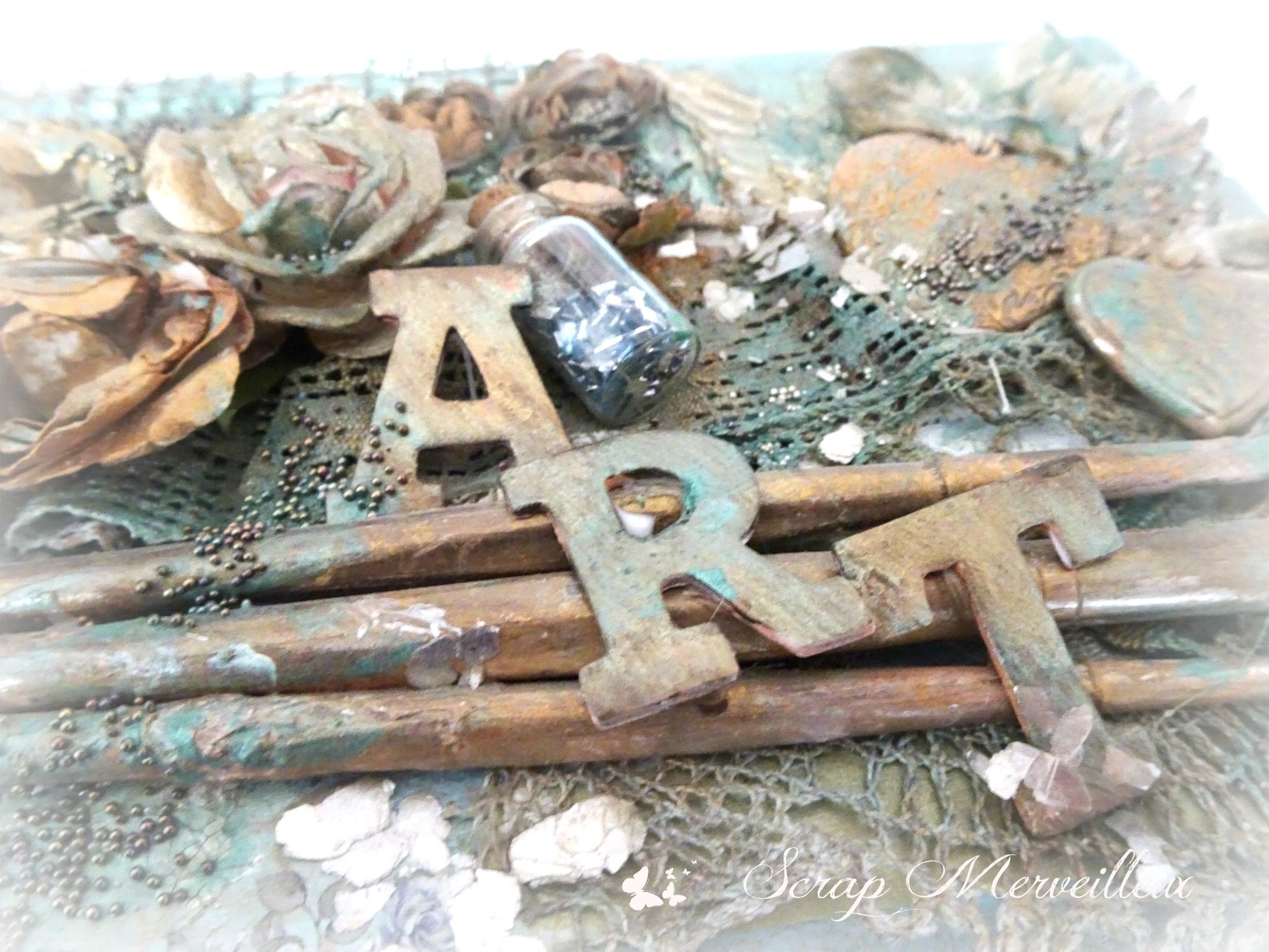 Boite ou petit coffre en bois de taille 27 x 15 x 7 cm de haut, fermant avec charnières et fermoirs métal. Le tout patiné à la main avec des éléments de décoration customisés dans les tons doré – cuivré – vert. Intérieur naturel veiné blanchi. Objet unique artisanal, boite ancienne. Le charmant jeu de couleurs a été obtenu par des couches de couleurs apposées à la main. Rehaussé de quelques touches de feuille d’or et de mica.