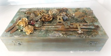 Boite ou petit coffre en bois de taille 27 x 15 x 7 cm de haut, fermant avec charnières et fermoirs métal. Le tout patiné à la main avec des éléments de décoration customisés dans les tons doré – cuivré – vert. Intérieur naturel veiné blanchi. Objet unique artisanal, boite ancienne. Le charmant jeu de couleurs a été obtenu par des couches de couleurs apposées à la main. Rehaussé de quelques touches de feuille d’or et de mica.